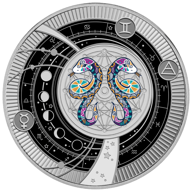 Bliźnięta, znak Powietrza rządzony przez Merkurego, symbolizują zmienność, przenikliwość i intelektualną ciekawość świata. Moneta wykonana ze srebra