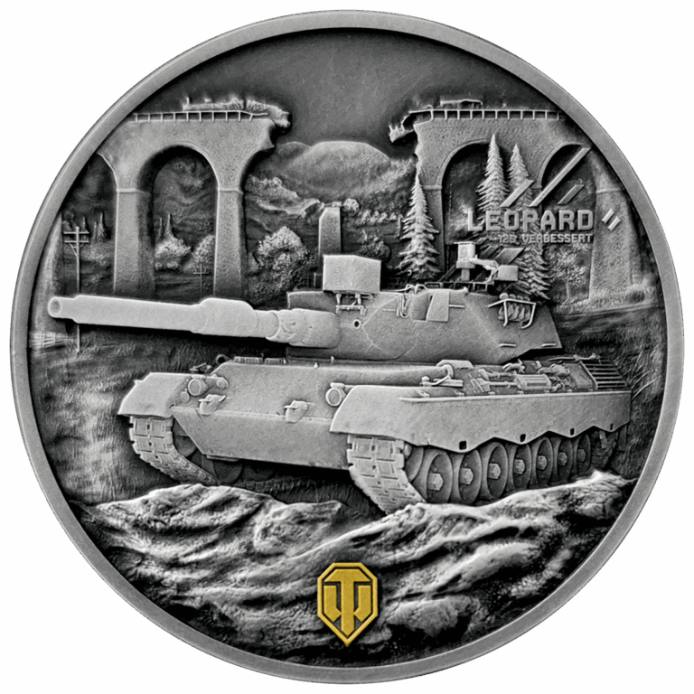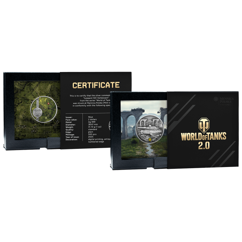 Moneta „LEOPARD 120 VERBESSERT” została wykonana z 1 uncji czystego srebra, w limitowanym nakładzie 500 sztuk, z numerowanym obrzeżem i unikatowym wykończeniem antique finish z drukiem cyfrowym. Na rewersie odwzorowano czołg Leopard 120 Verbessert – debiutujący właśnie w aktualizacji World of Tanks 2.0, która ukazała się 3 września – przedstawiony w wysokim reliefie na tle dynamicznego krajobrazu. Awers zdobi mapa „Westfield”, znana graczom z charakterystycznego, zniszczonego wiaduktu.