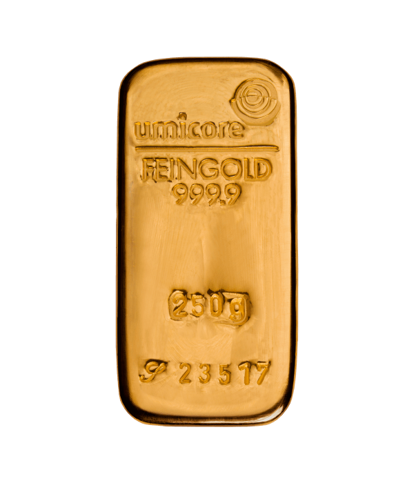 Sztabka złota ze znakami Umicore o masie 250 g. Masa, próba oraz oznaczenie zagranicznego producenta zostały wybite bezpośrednio na sztabce i stanowią potwierdzenie jej autentyczności.