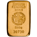 Sztabka o masie 250 g zapakowana w folię bez certyfikatu. Masa, próba oraz oznaczenie zagranicznego dostawcy zostały wybite bezpośrednio na sztabce i stanowią potwierdzenie jej autentyczności.