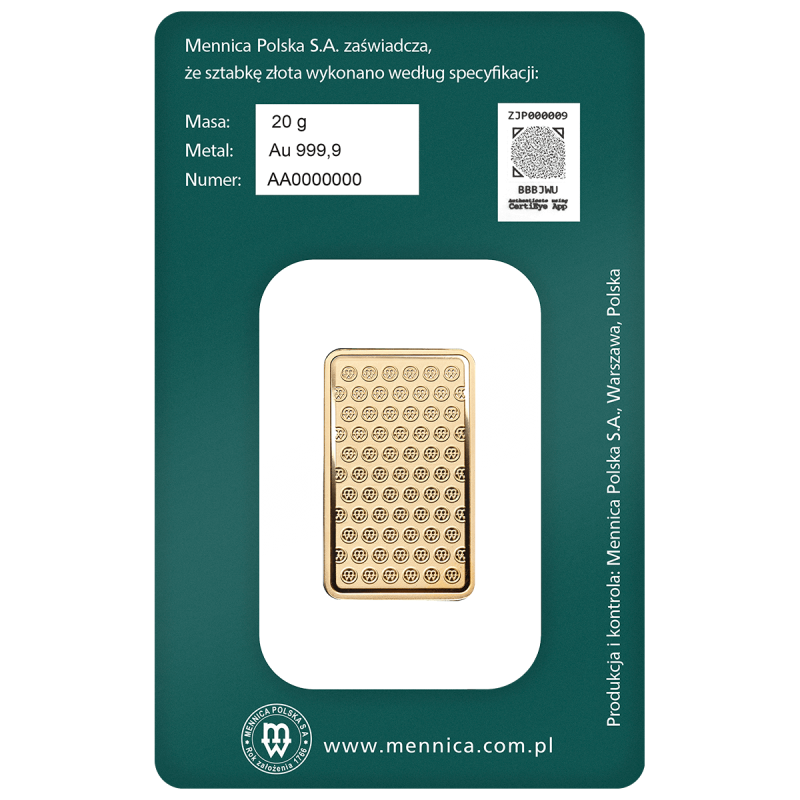 Sztabka o masie 20g sprzedawana jest w specjalnym opakowaniu gwarantującym jej autentyczność – CertiCard. Na opakowaniu podana jest specyfikacja sztabki – gramatura, zawartość złota oraz unikalny numer oferowanej sztabki. Na wizerunku sztabki znajduje się współczesny znak Mennicy Polskiej, a także masa sztabki oraz próba złota.