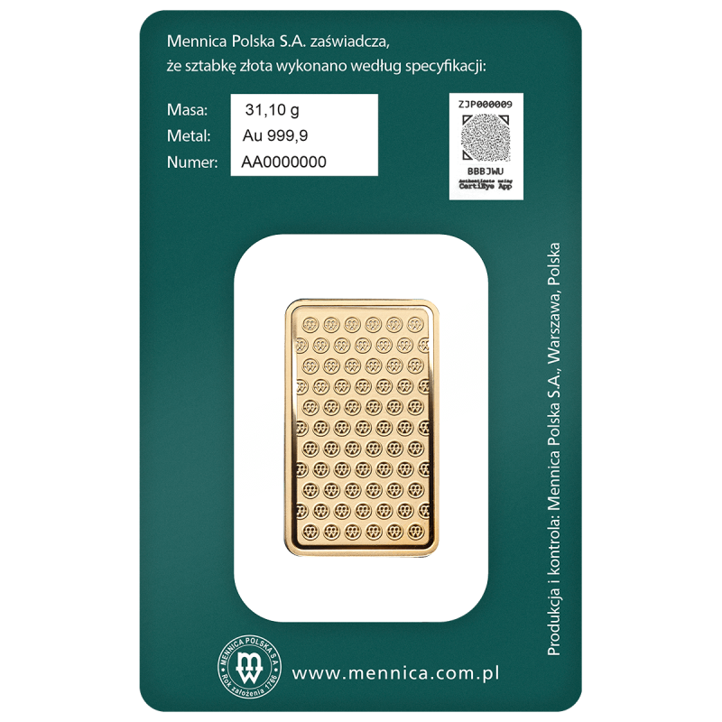 Sztabka o masie 31,1g sprzedawana jest w specjalnym opakowaniu gwarantującym autentyczność sztabki – CertiCard. Na opakowaniu podana jest specyfikacja sztabki – gramatura, zawartość złota oraz unikalny numer oferowanej sztabki. Na wizerunku sztabki znajduje się współczesny znak Mennicy Polskiej, a także masa sztabki oraz próba złota.